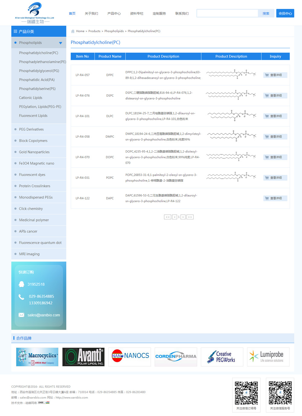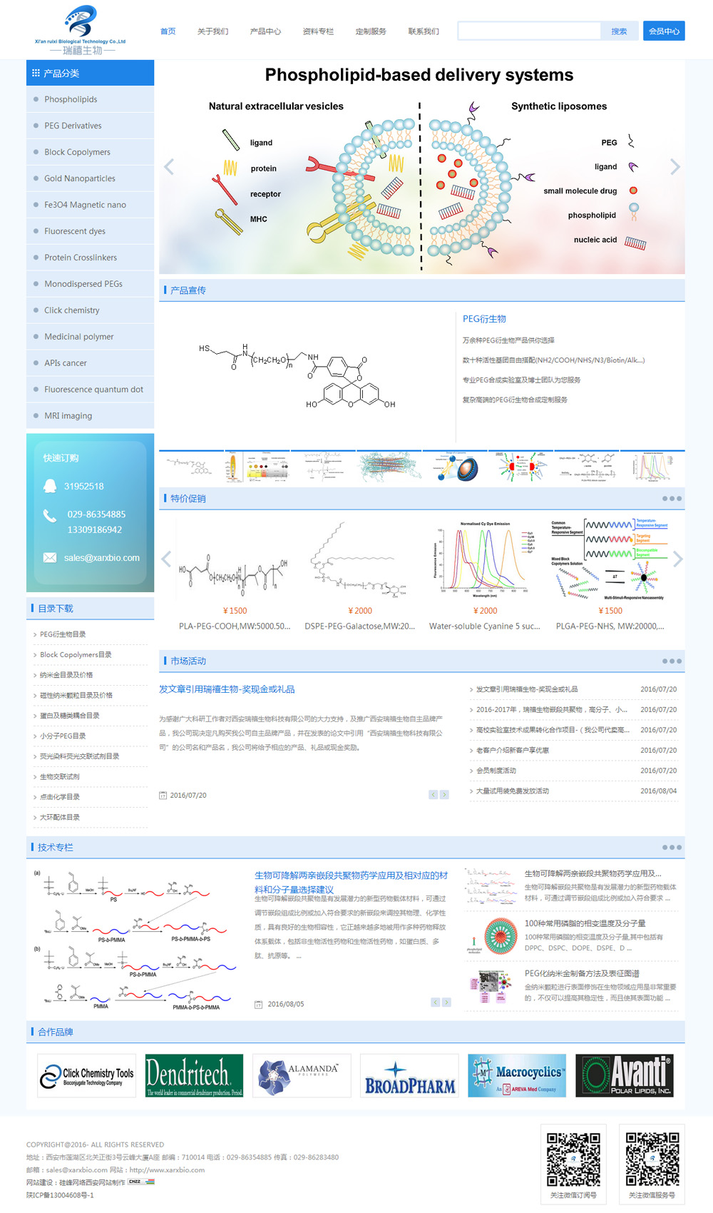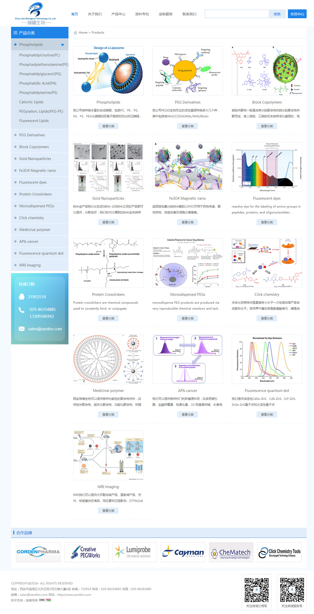 西安瑞禧生物科技有限公司是國內一家知名的生物科技公司,我公司專(zhuān)注于藥物傳遞和藥物靶向方向的科研研究,公司所有的產(chǎn)品及材料都是關(guān)于藥物傳遞和藥物靶向方向,公司成立之初以代理國外進(jìn)口品牌的為主,產(chǎn)品主要涉及磷脂、PEG衍生物等產(chǎn)品,隨著(zhù)公司的發(fā)展和擴大,公司更注重自主品牌的建立和更廣泛的產(chǎn)品拓展,我公司為建立和發(fā)展自主品牌和產(chǎn)品,已成立自己的合成實(shí)驗室,為廣大客戶(hù)提供西安瑞禧生物自主品牌的產(chǎn)品,與此同時(shí)在未來(lái)3-5年或者更久我公司將持續和各大高校的重點(diǎn)實(shí)驗室的教授合作,生產(chǎn)高品質(zhì),高科技附加值的產(chǎn)品或定制復雜特殊的試劑產(chǎn)品。