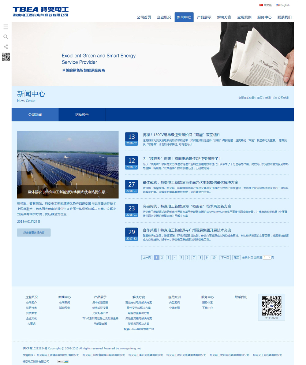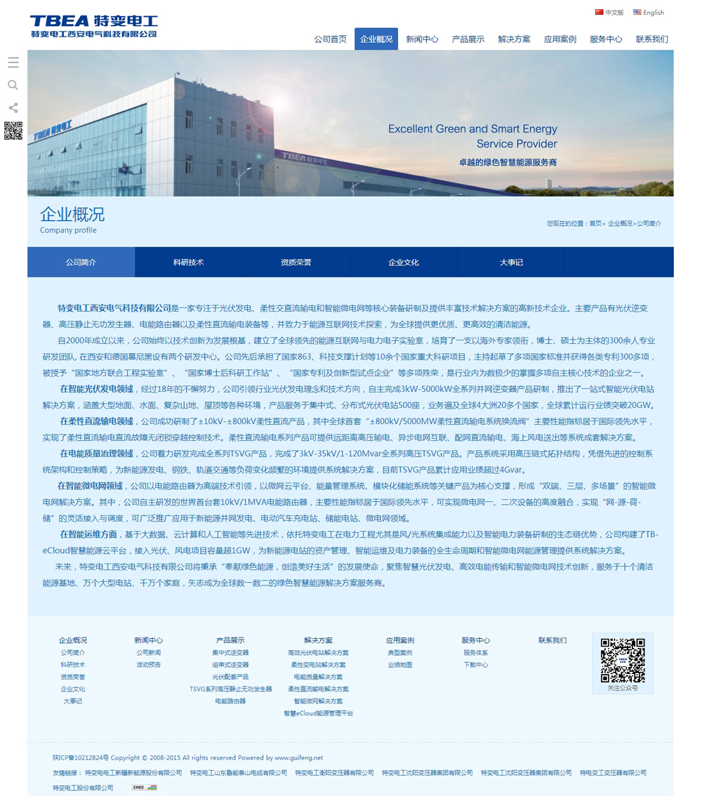特變電工西安電氣科技有限公司是一家專(zhuān)注于光伏發(fā)電、柔性交直流輸電和智能微電網(wǎng)等核心裝備研制及提供豐富技術(shù)解決方案的高新技術(shù)企業(yè)。主要產(chǎn)品有光伏逆變器、高壓靜止無(wú)功發(fā)生器、電能路由器以及柔性直流輸電裝備等,并致力于能源互聯(lián)網(wǎng)技術(shù)探索,為全球提供更優(yōu)質(zhì)、更高效的清潔能源。